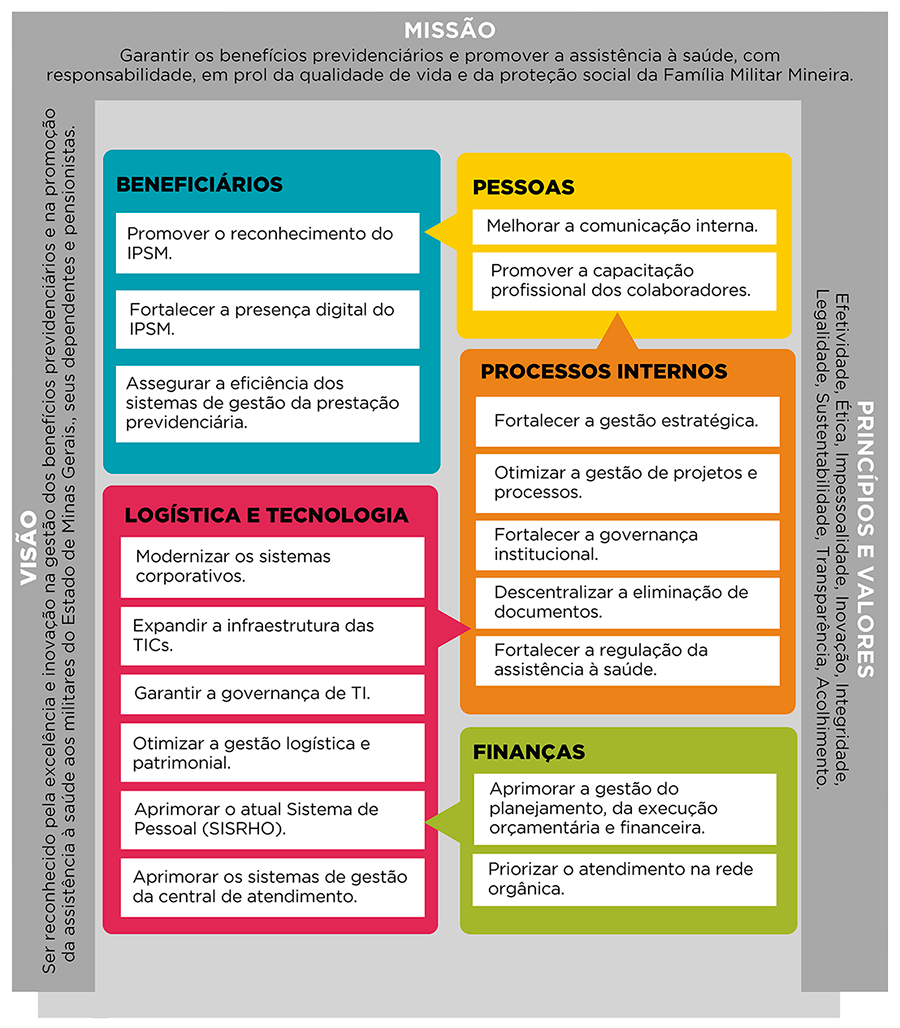 O Planejamento Estratégico do Instituto de Previdência dos Servidores Militares do Estado de Minas Gerais (IPSM) é um instrumento de gestão que orienta a atuação institucional, define diretrizes e prioridades e alinha ações, processos e recursos aos objetivos estratégicos da entidade. Por meio desse planejamento, o IPSM busca fortalecer a governança, aprimorar a qualidade dos serviços prestados, promover a eficiência administrativa e assegurar a sustentabilidade de suas atividades, sempre em conformidade com os princípios da administração pública e com o compromisso de atender, de forma responsável e transparente, seus segurados e a sociedade.