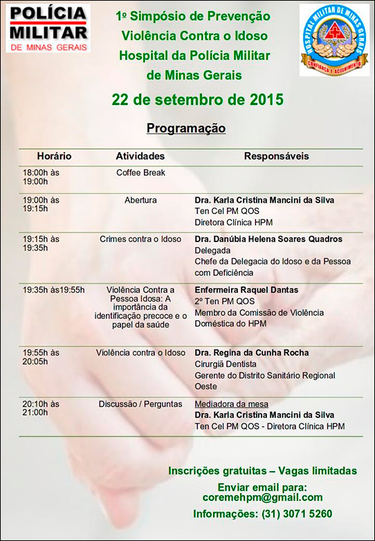 O Hospital da Polícia Militar de Minas Gerais (HPM) realiza, no dia 22 de setembro de 2015, o 1º Simpósio de Prevenção à Violência Contra o Idoso. O evento acontece no auditório do HPM, a partir das 18 horas. As inscrições são gratuitas e podem ser realizadas através do envio de e-mail para: coremehpm@gmail.com.