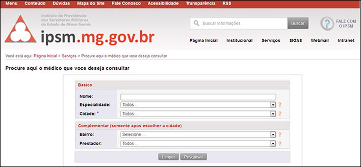 No site, também é possível consultar o corpo clínico pelo nome do profissional e especialidade. O link para acessar essa opção também fica abaixo da caixa de pesquisa, na página inicial do IPSM. Ao clicar, uma nova janela se abrirá e será possível escolher as opções.