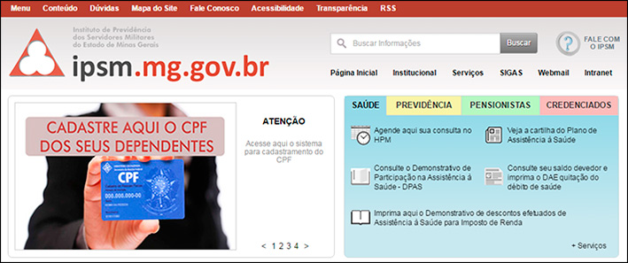 Para facilitar a inclusão do CPF dos dependentes no cadastro do IPSM, foi disponibilizado no site do Instituto (www.ipsm.mg.gov.br) o acesso por meio de um banner, conforme a seguir: