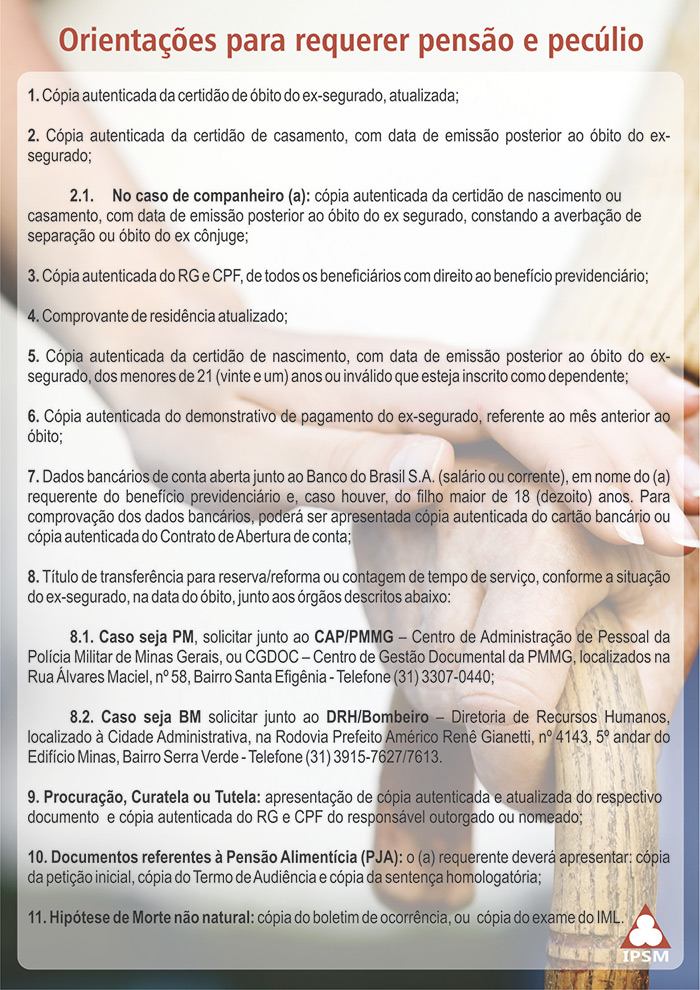 Informamos que a responsabilidade por retirar, emitir, solicitar e apresentar ao IPSM os documentos mencionados acima é exclusivamente dos respectivos requerentes. É importante lembrar que, no caso da solicitação de pensão e pecúlio, os documentos mencionados acima deverão ser entregues em duplicidade.