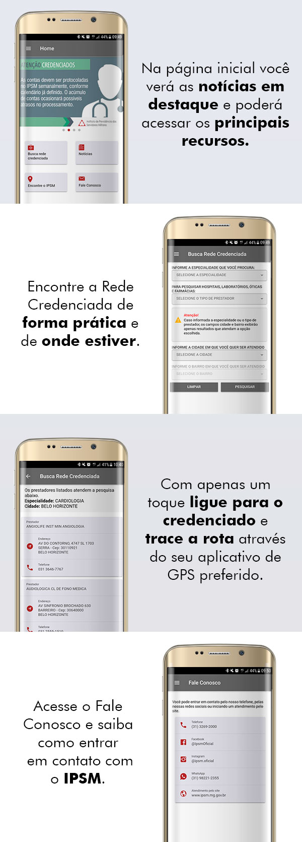 Com a ferramenta, os beneficiários poderão consultar a Rede Credenciada a qualquer hora, acessar a localização do credenciado no mapa, visualizar o telefone de contato e realizar buscas rápidas por especialidade, tipo de prestador ou procedimento médico. O aplicativo concede, ainda, fácil acesso às Redes Sociais do IPSM e ao Canal Fale Conosco, além da localização das Coordenadorias no interior do Estado e acesso às notícias do Instituto.
