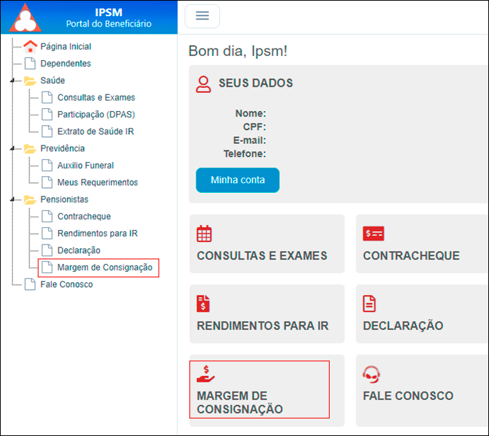 Consultar a margem de consignação para pensionistas ficou mais rápido e fácil, basta acessar o Portal do Beneficiário e clicar em “MARGEM DE CONSIGNAÇÃO” na tela principal, ou pelo menu Pensionistas. A consulta pode ser feita também através do aplicativo do IPSM.
