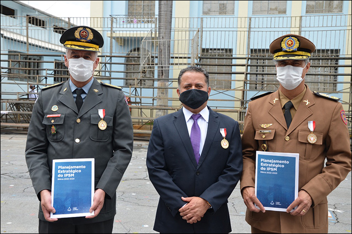 Antes do encerramento da Solenidade, aconteceu o lançamento oficial do Planejamento Estratégico do IPSM para o biênio 2022-2023. O Coronel Vinícius entregou a versão impressa do E-book aos representantes do Comando-Geral da Polícia e Comando-Geral do Corpo de Bombeiros Militar do Estado de Minas Gerais.